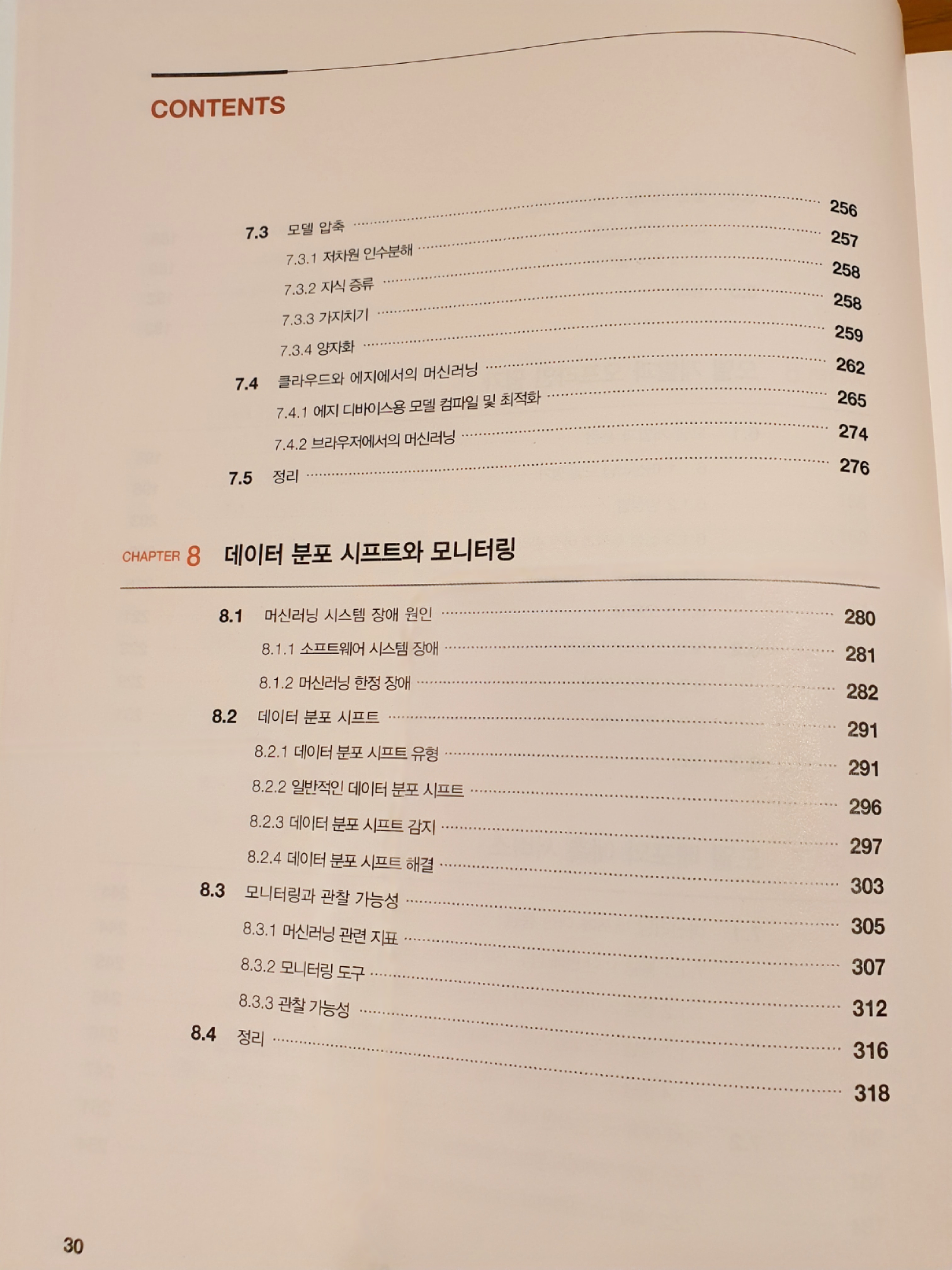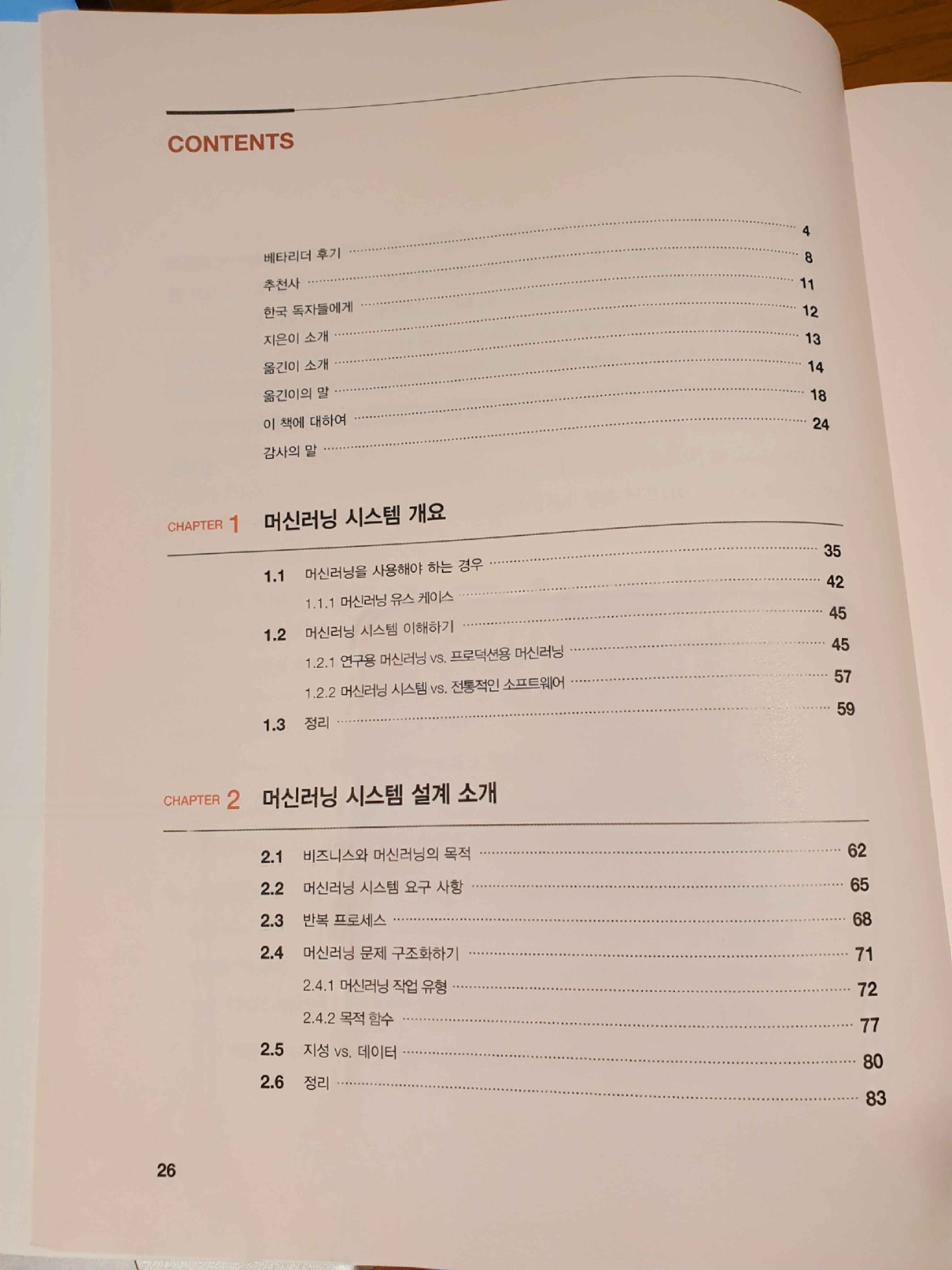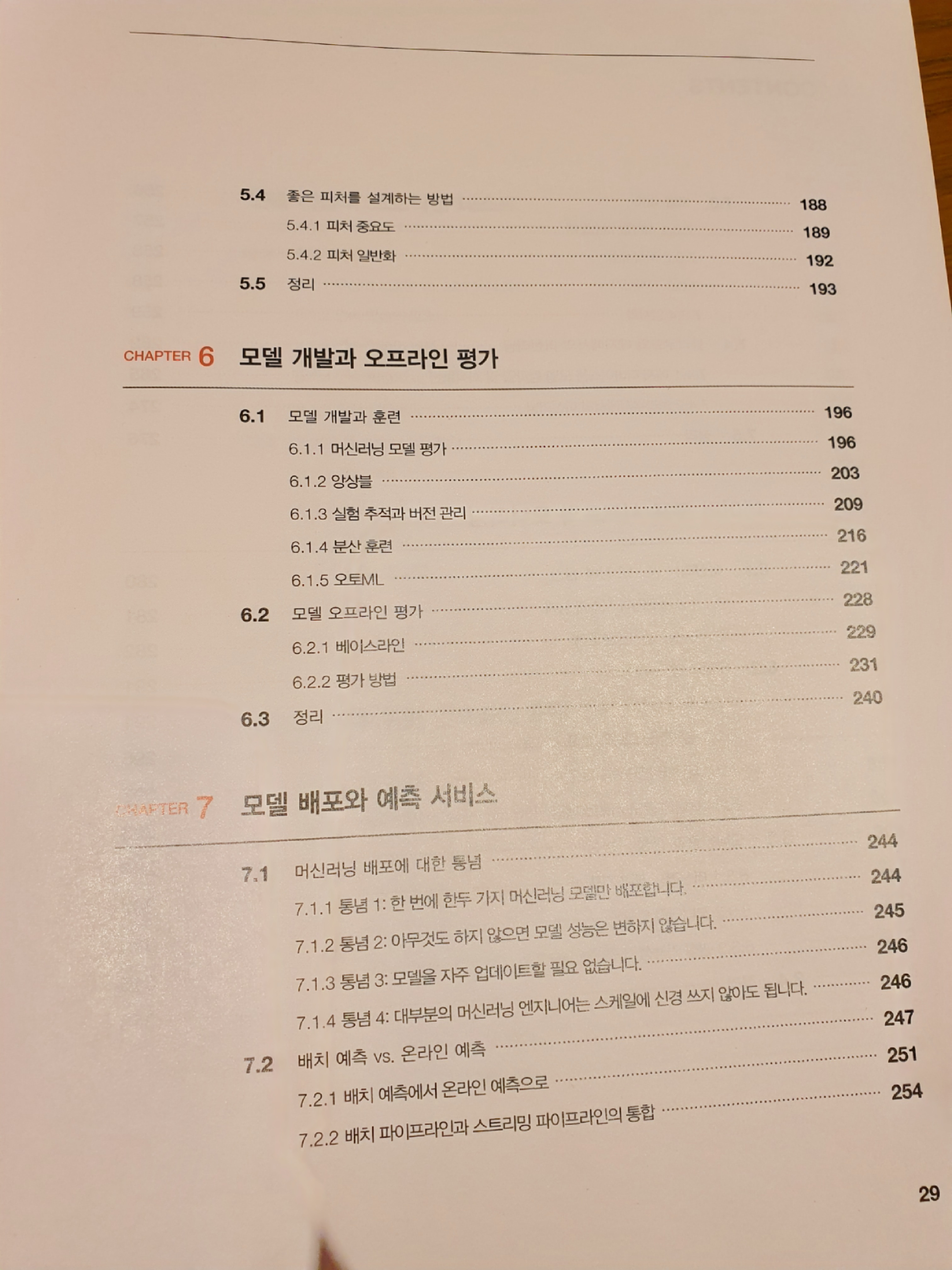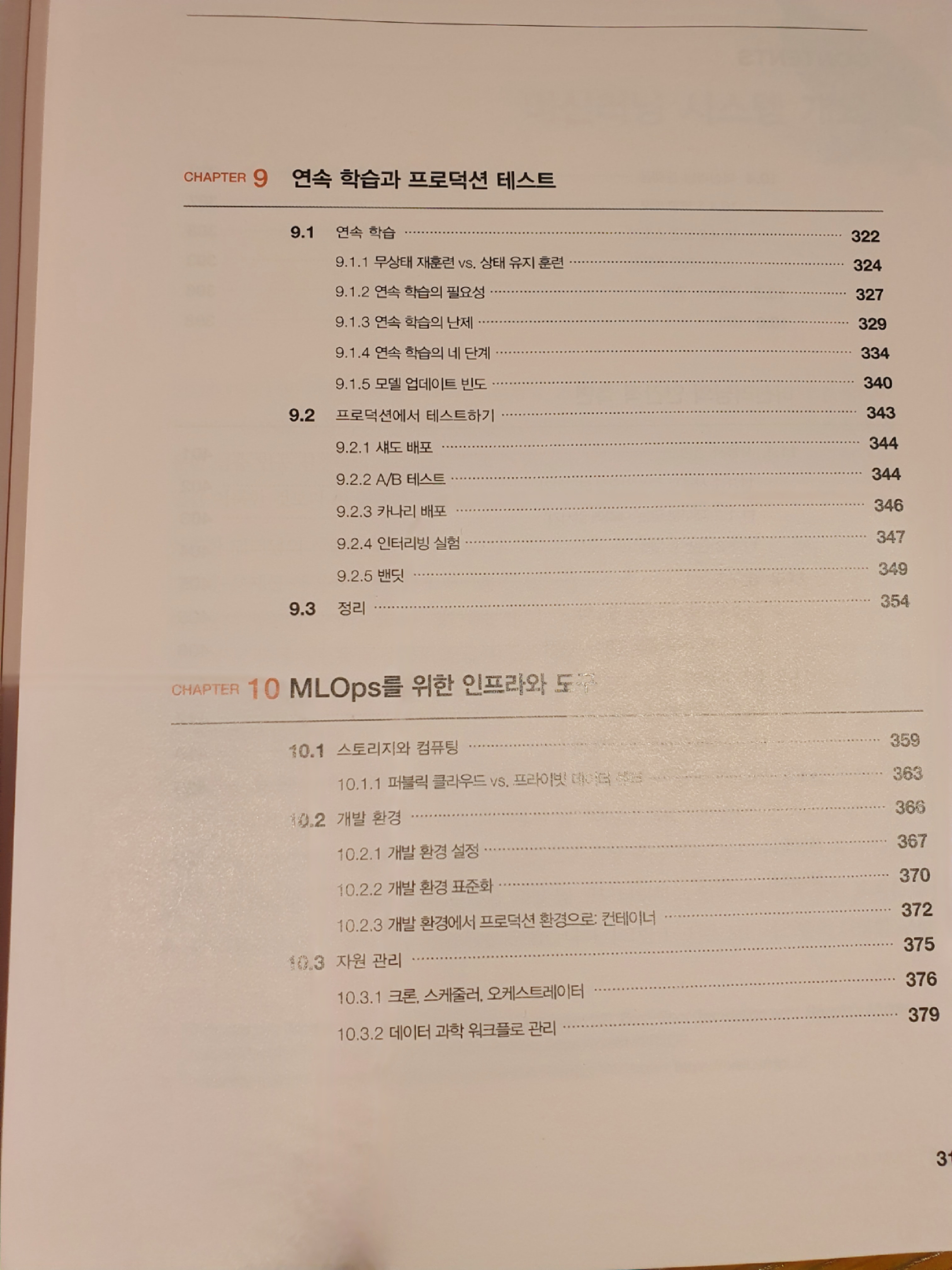 이 책은 머신러닝 + 시스템 설계라는 주제를 가지고 있다. 그리고 머신러닝 기초 -> 머신러닝 실무 관련 지식 -> 인프라 / 시스템 순으로 설명을 하고 있다. 그 중 머신러닝 기초와 인프라 / 시스템 쪽은 필자가 읽을만 했는데 실무 관련 지식들은 자세히 보지 못하였다. 이 책의 구성이 꽤 괜찮다고 느껴지는 건 머신러닝 시스템 설계를 어떻게 해야할지 감이 잘 안 잡히는 사람에게는 어느정도 청사진을 그려줄 수 있다는 점이고, 필자가 거기에 해당되었기 때문이다. 목차는 아래 사진과 같다.