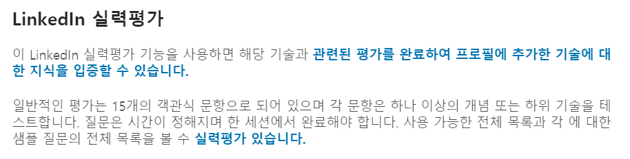 링크드인앱을 깔아놓으면 누가 프로필을 봤다는 알람이 올 때가 있습니다. 대부분의 알람은 무음으로 설정해놔서 별 생각없이 지나가기 마련인데 가끔은 심심해서 링크드인앱에 들어가 보게 되네요. 근데 최근(?)에 보유기술의 실력을 평가해보는 기능이 생겼더라구요. 막 진지하게 본 것은 아니지만 궁금해서 보게 되었습니다.